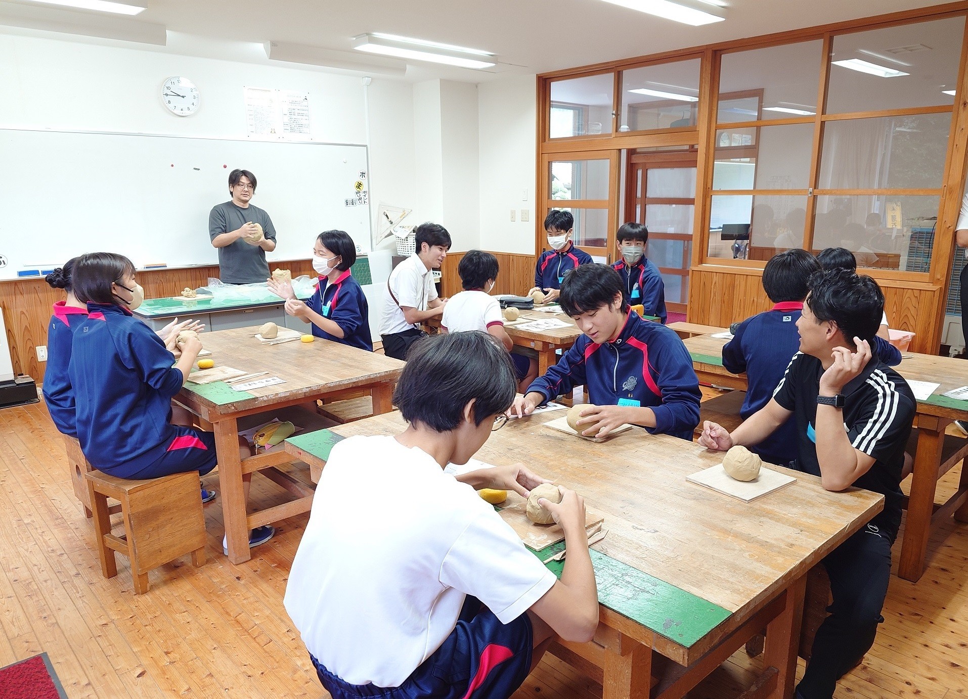 渋谷英一先生を講師に、萩焼の説明やてびねりによる萩焼制作、ろくろ体験を行いました。中学3年生9名、小学4年生1名が参加し、先生方と一緒に萩焼制作を行いました。